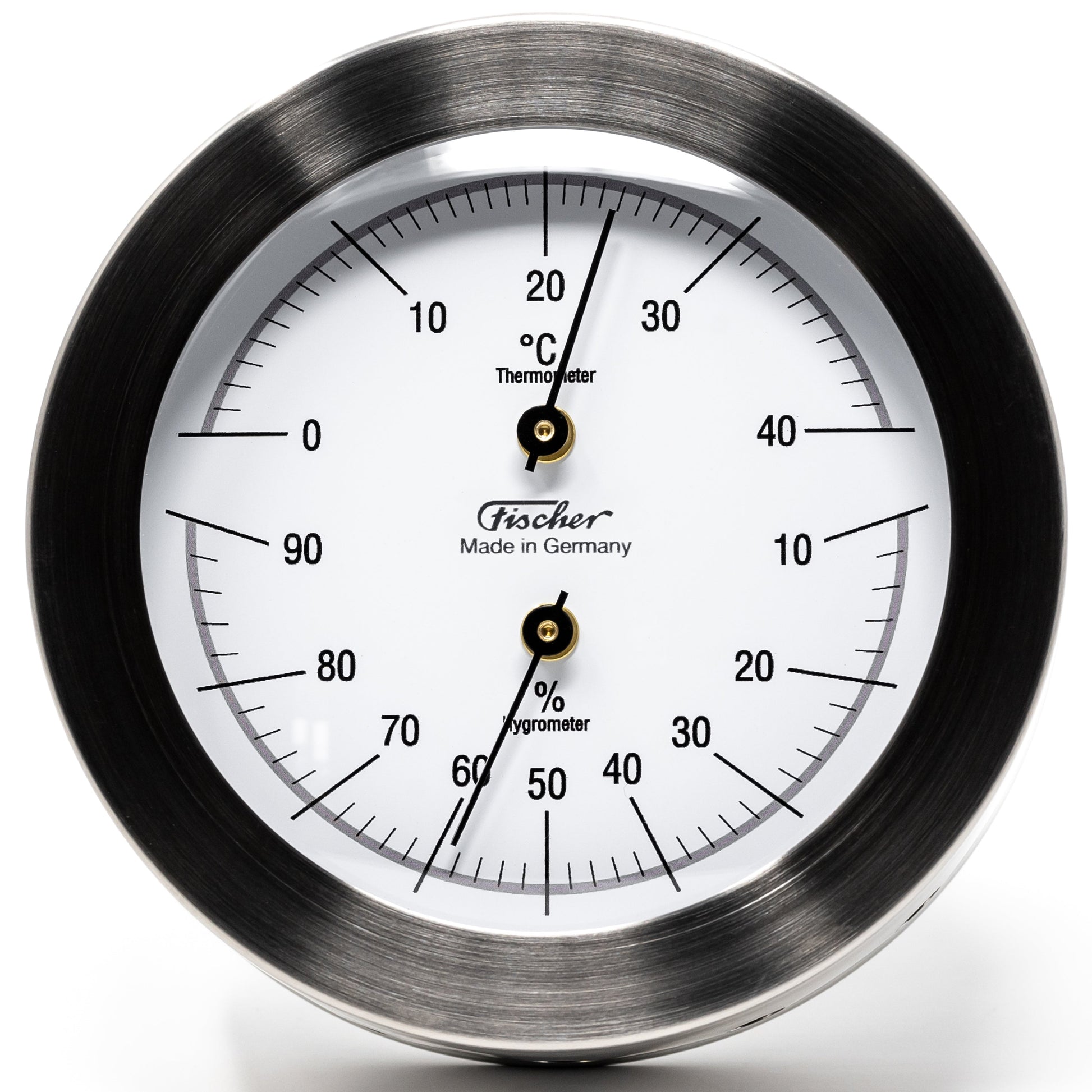 Thermo-hygrometer with stainless steel housing, green or red.