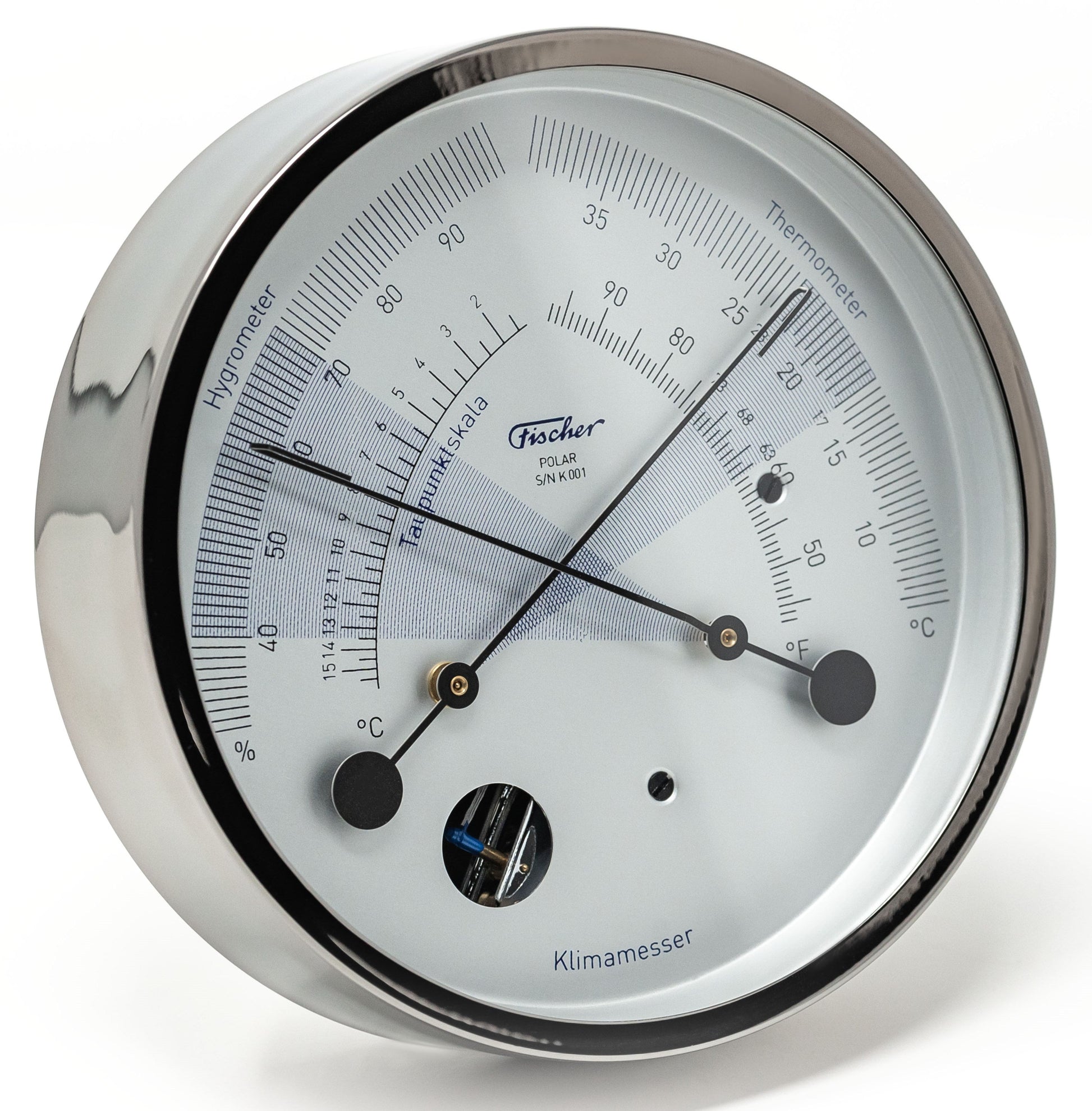 All measuring instruments of the " POLAR " series are precisely adjusted in the manufacturer's factory and work completely maintenance-free. Each individual instrument is provided with a serial number. The curved instrument hands allow a parallax-free reading of the respective measured value. The housing of the instrument series (diameter 133 mm. height 45 mm) consists of anthracite chrome-plated brass. The fine mechanical instrument series " POLAR " is handmade at FISCHER in Germany.