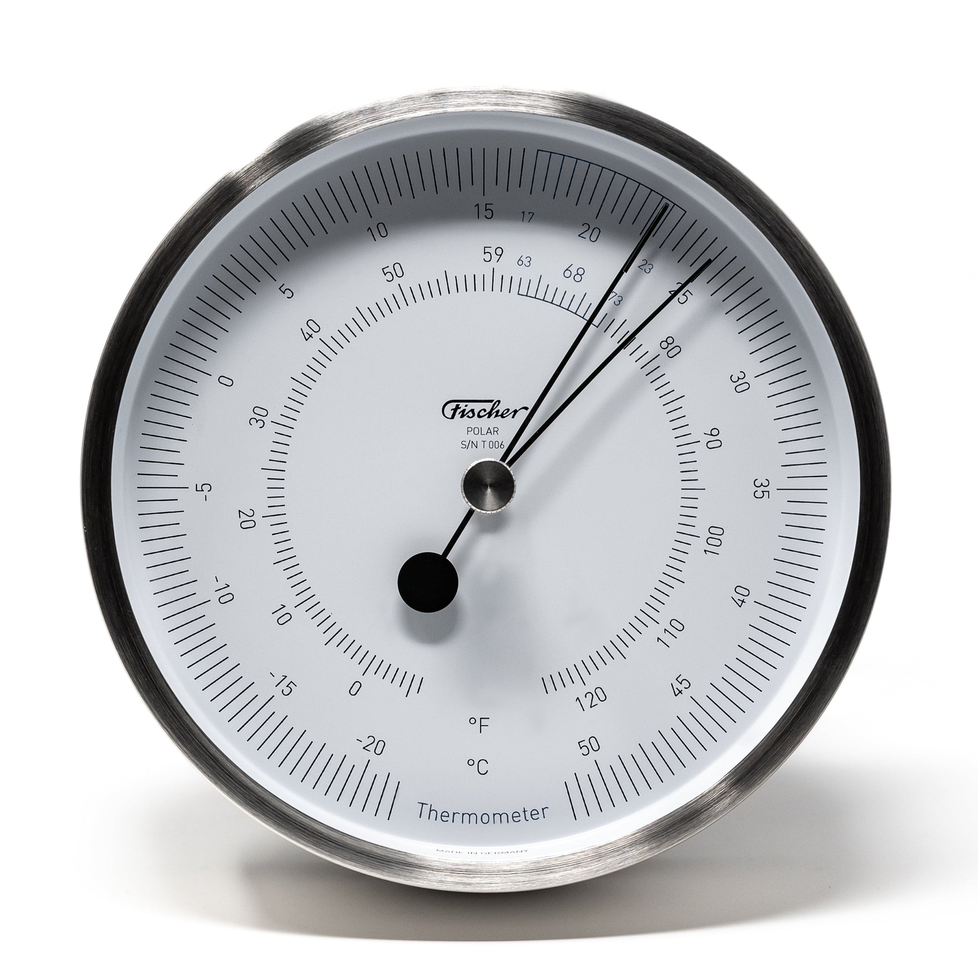 All measuring instruments are precisely adjusted in the manufacturing plant and work completely maintenance-free. Each individual instrument is provided with a serial number. The curved instrument pointer enables a parallax-free reading of the respective measured value. In addition, a change in the measured value can be easily recognized with the help of the index pointer attached to the glass. The housing (diameter 133 mm. Height 45 mm) of the instrument series consists of brushed brass resp. stainless steel. The precision mechanical POLAR instrument series is handmade at FISCHER in Germany.